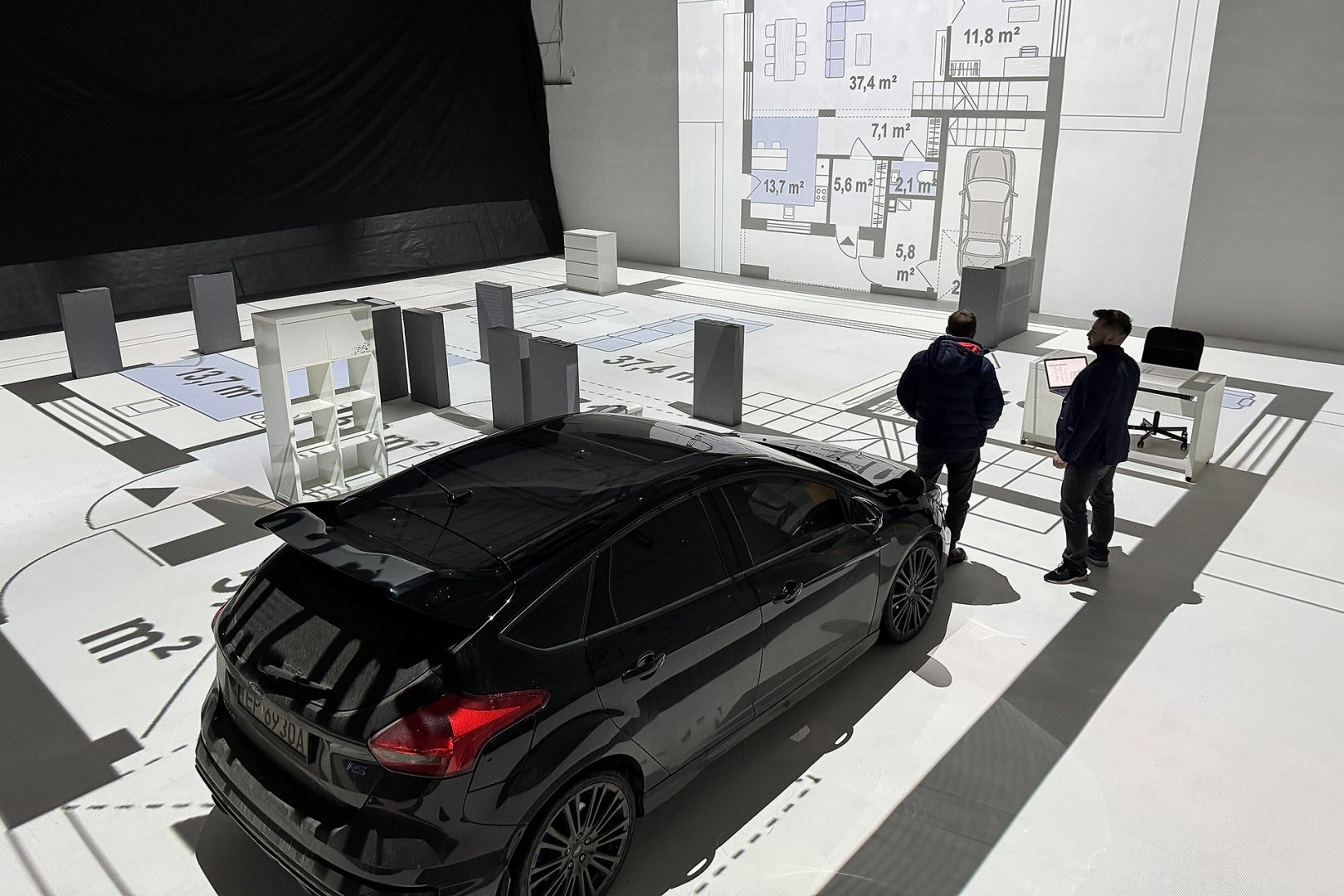 Powierznia wyświetlania hali projekcyjnej to 15 x 18 metrów, jednak jej wymiar nie jest przeszkodą w analizowaniu projektów o większych wymiarach. W takich przypadkach przechodzimy przez analizę projektu etapami pozostając przy rzutowaniu w skali 1:1. Po zakończeniu prac nad jednym fragmentem projektu o rozmiarach 15x18 metrów rzut jest przesuwany do kolejnego wycinku. W ten sposób dajemy możliwość pracy nad projektami bez ograniczeń gabarytowych.